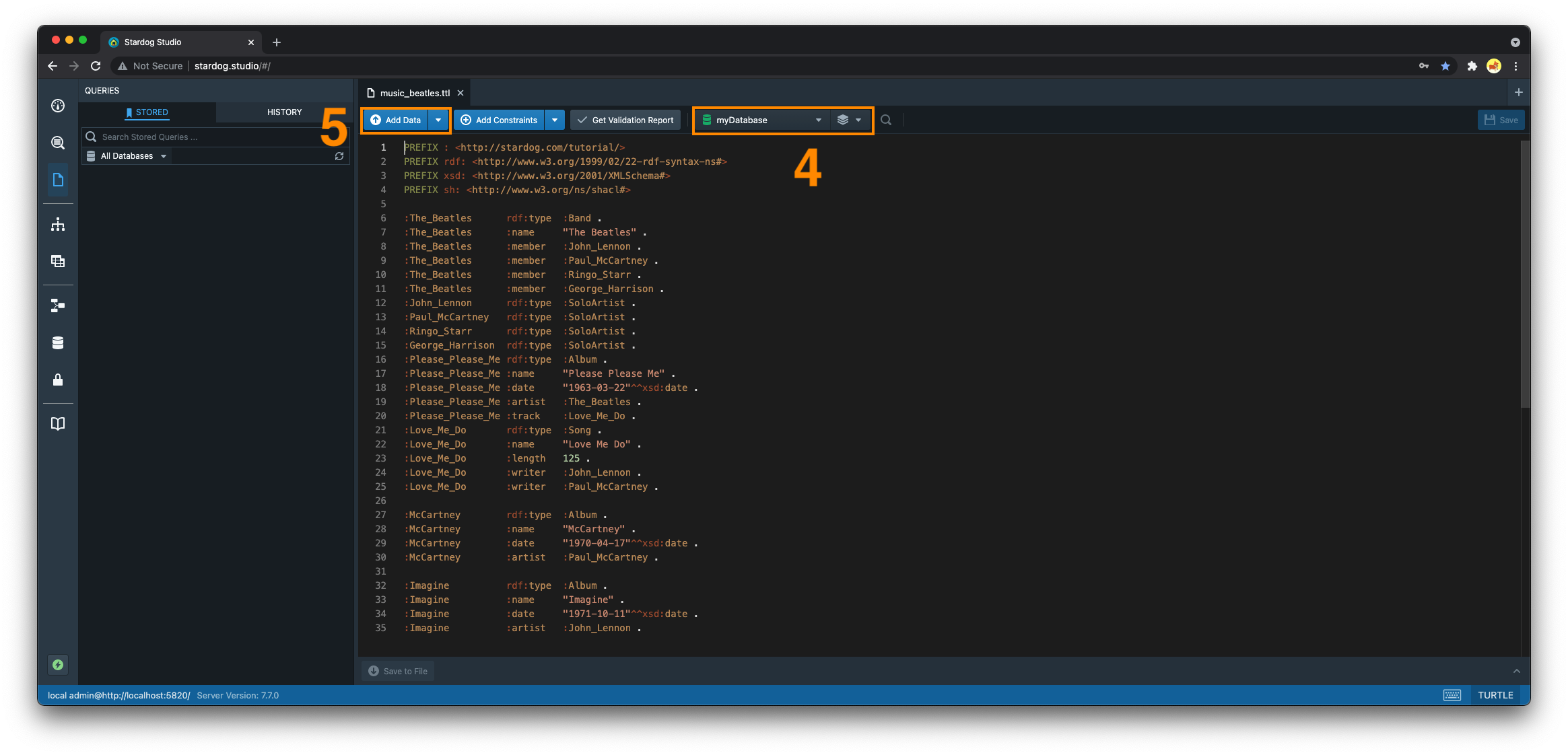 stardog data add myDatabase input0.ttl @urn:g1 input1.ttl input2.ttl @urn:g2 input3.ttl @ input4.ttl