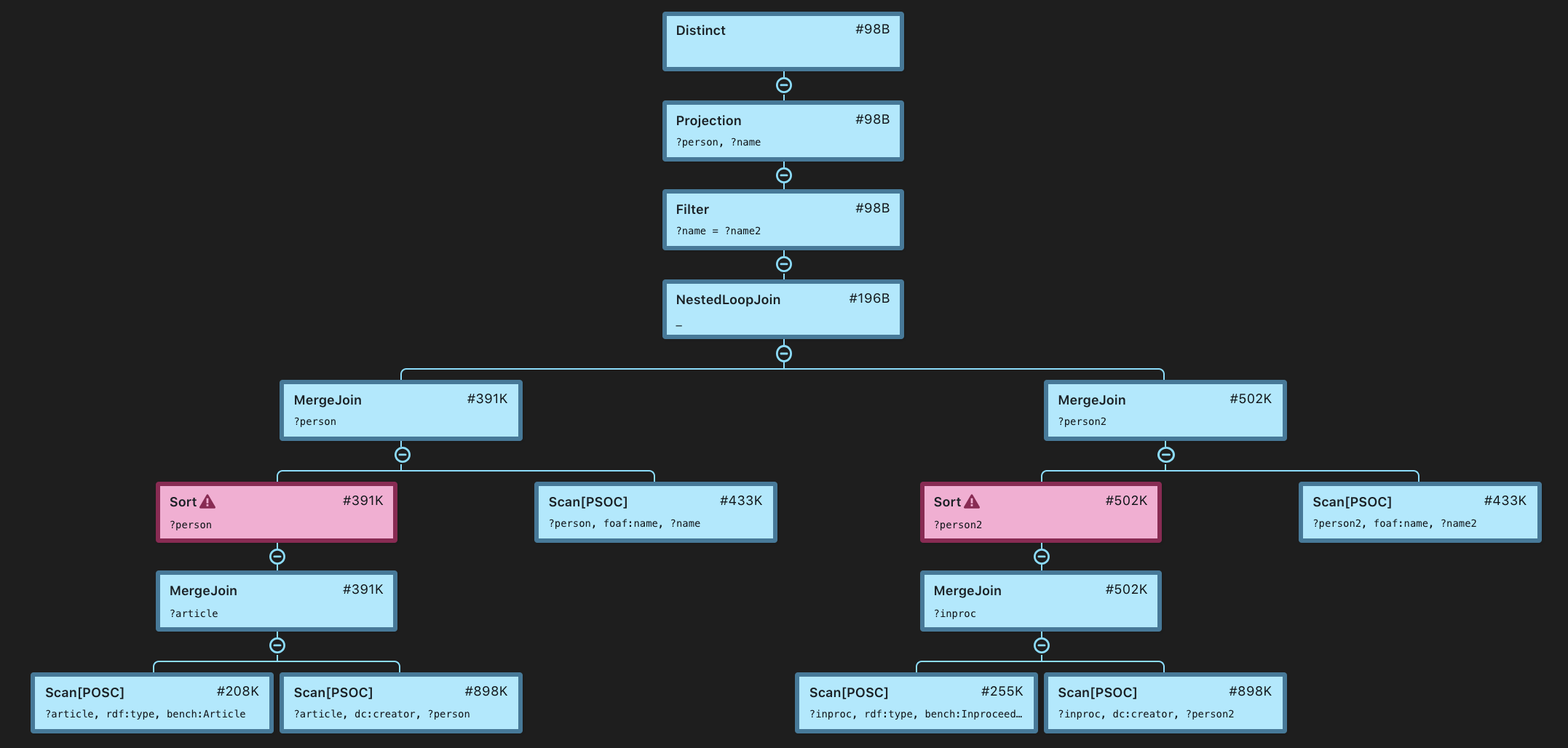 This means that all solutions representing the join of ?article rdf:type bench:Article and ?article dc:creator ?person will be put in a sequence ordered by the values of ?person. Stardog expects to sort 391K solutions before they can be further merge-joined with the results of the ?person foaf:name ?name pattern. Alternatively the engine could build a hash table instead of sorting solutions; such decisions are made by the optimizer based on a number of factors.