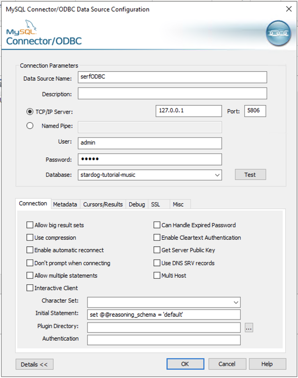 sessionVariablesoption can be set on a MySQL Connector/J (JDBC) connection. This can be added directly to the connection URL, e.g.jdbc:mysql://localhost:5806/db?sessionVariables=reasoning_schema='default'. - The Tableau MySQL connection dialog has an option in the bottom left called